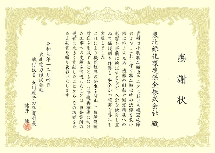 本感謝状は,当社女川支社で受注している「女川原子力発電所